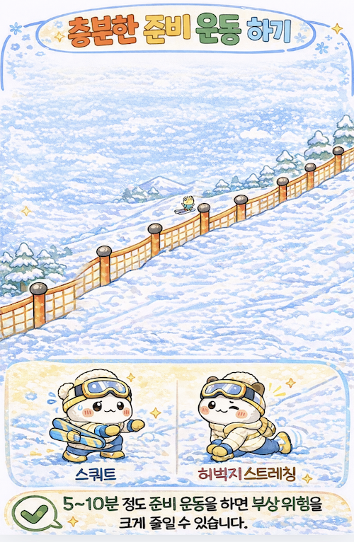 스키 부상의 대부분은 준비 부족이나 잘못된 자세, 무리한 속도 때문에 발생합니다. 따라서 몇 가지 기본적인 예방 방법만 지켜도 부상 위험을 크게 줄일 수 있습니다.