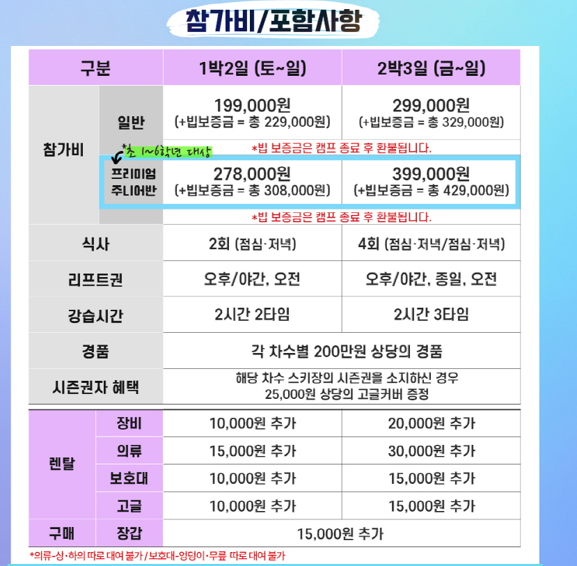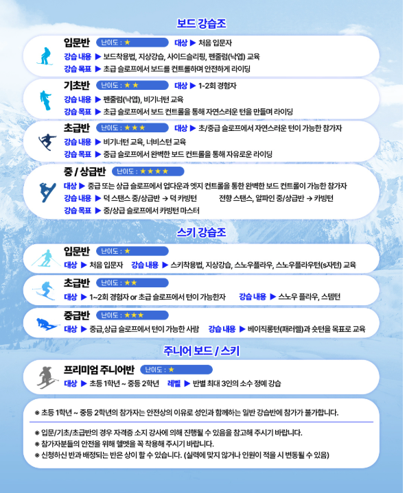 스키를 조금 접해보신 분들이라면 중급반 과정을 신청하시는게 좋을 것 같다. 입문이나… 초급이나 별만 차이 없는것 같다.