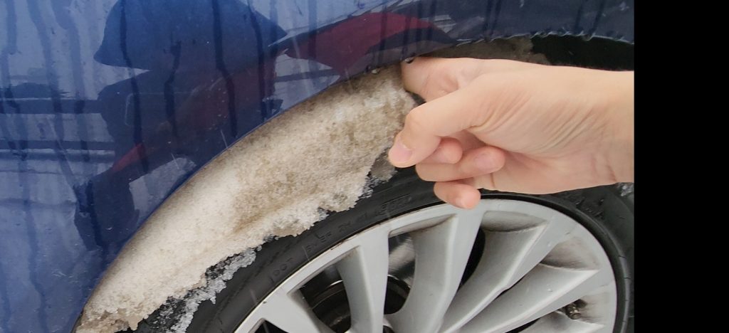 도착해서 주차하고 바퀴를 봤더니 눈이 이렇게… 바퀴에 덕지덕지 붙어있었다 ㅠㅜ