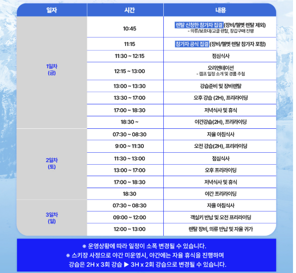 가성비 일정은 2번 강습인 1박2일이 좋은 듯 하다...2박3일은 뭔가 프리라이딩이 포함되고 강습은 한번더 받는 일정이라 좀 아깝다라는 생각이 들었다.